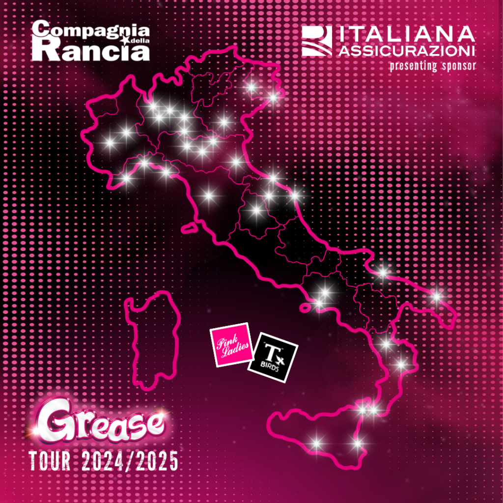 Con oltre 60 repliche in 21 città e una lunga collezione di “tutto esaurito” e più di 70.000 spettatori che hanno già applaudito lo spettacolo solo nei primi cinque mesi del 2024, riparte a novembre il tour 2024/2025 del musical Grease, per scatenarsi ancora a teatro con la #greasemania! Prima tappa di un lungo viaggio che attraverserà l’Italia da Nord a Sud per ben 33 città, dopo una residenza di allestimento in territorio marchigiano che sottolinea ancora una volta il legame di Compagnia della Rancia con le Marche e AMAT, è quella dal 7 all’11 novembre a Pesaro, Capitale Italiana della Cultura 2024. Il tour 2024/25 proseguirà fino a primavera; Grease tornerà a grande richiesta nei teatri che accolgono lo spettacolo di Compagnia della Rancia in ogni stagione come un appuntamento immancabile e attesissimo dal pubblico (Milano, Bologna, Genova, Torino, Padova, Brescia e Trieste, dove si festeggerà l’arrivo del 2025) e arriverà in tantissime altre città dove è già caccia al biglietto; in questa stagione, Grease torna dopo molte stagioni anche in Campania, Puglia, Calabria e Sicilia; il tour aggiornato, che tocca ben 12 regioni, è sempre disponibile su grease.musical.it/tour.