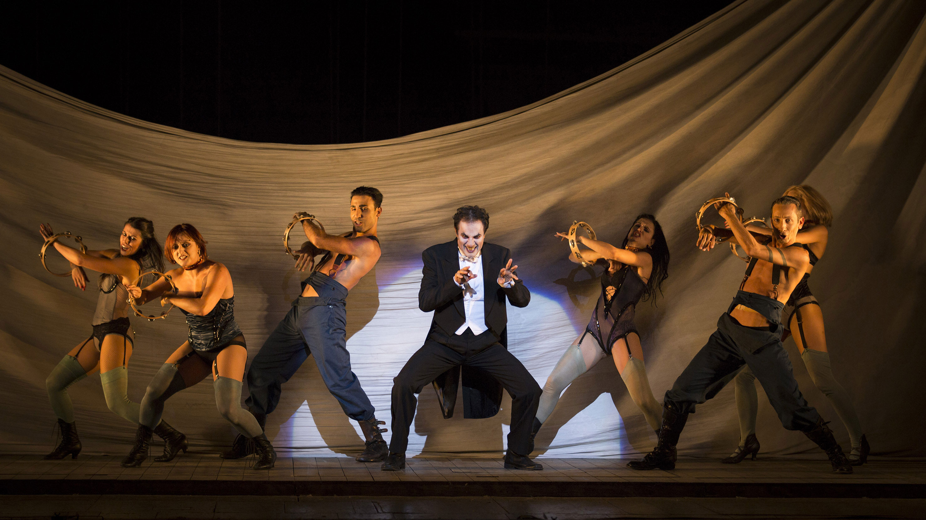 Un ruolo completamente differente per Giampiero Ingrassia/Maestro di Cerimonie, il personaggio che prende vita solo sul palcoscenico del Kit Kat Klub. È il filo conduttore che rappresenta l’aspetto ludico della storia – vuole che tutti si lascino travolgere dall’atmosfera licenziosa del locale e si divertano per dimenticare i problemi che esistono realmente – e allo stesso tempo quello ambiguo e stravagante. Un Maestro di Cerimonie ammiccante, ammaliante, tentatore, che apre agli spettatori le porte del club berlinese, sempre pronto a ridere e scherzare, ma con una morale corrotta e decadente, sottolineata anche dal trucco sapiente (un misto tra Joker, il Corvo e il cantante dei Kiss Gene Simmons), una maschera che trasuda inquietudine. Ingrassia si cimenta in un ruolo complesso e dalle mille sfaccettature: recita ma soprattutto canta, con un momento di particolare intensità in “I don’t care much/Non importa”. E nell’invito del Maestro di Cerimonie agli spettatori ad affrontare la realtà e ad abbandonare l’indifferenza è racchiuso il senso profondo dello spettacolo: “Vi emozionerete, piangerete, sicuramente, e vi farete molte domande”.