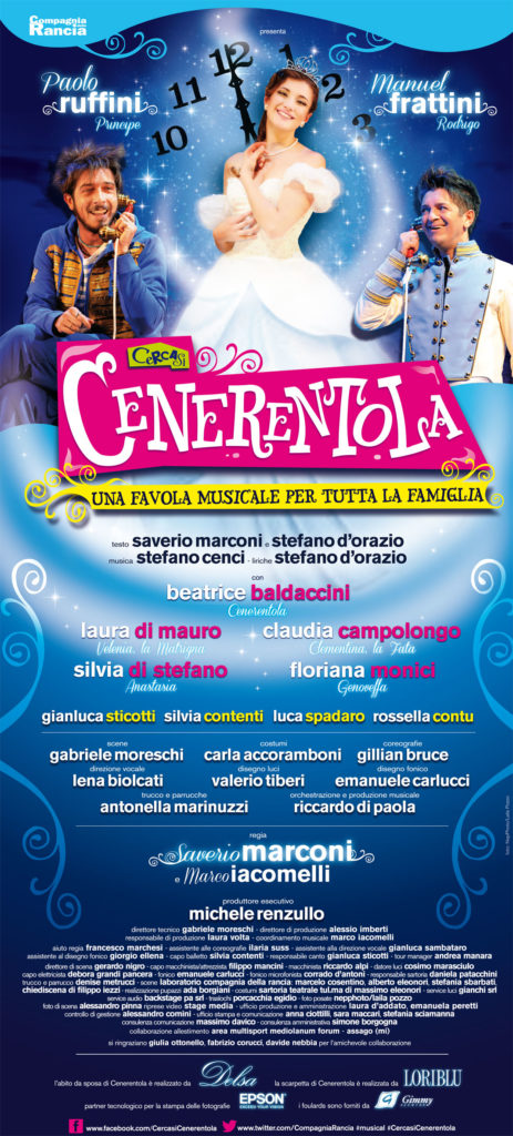 Una carrozza, i rintocchi di mezzanotte, Matrigna e Sorellastre e una scarpetta di cristallo che calza a pennello solo a una misteriosa e bellissima ragazza… Non c’è dubbio: stiamo parlando di Cenerentola, una della favole più amate e raccontate. Aggiungiamo come protagonista il Principe per antonomasia (interpretato dal poliedrico ed esilarante Paolo Ruffini, che torna in teatro dopo Colorado in tv e il grande successo del film Fuga di Cervelli) e Rodrigo, il fidato consigliere del Principe, severo all’apparenza ma con un gran cuore (Manuel Frattini, indiscusso punto di riferimento del musical italiano) e abbiamo quasi tutti gli ingredienti per una nuova commedia musicale per tutta la famiglia.