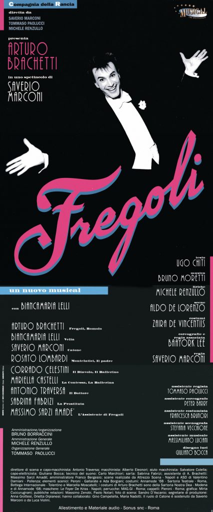 Una persecuzione! Ecco cos’era! Me lo trovavo nello specchio del camerino, nei ritagli delle recensioni, addirittura nel palco N.5 (quello di solito occupato dal Fantasma dell’Opera) a guardarmi, studiarmi, compararmi… E basta! Naturalmente sto parlando dell’ombra di Fregoli, il grande trasformista che visse a cavallo (cloppete, cloppete) degli ultimi due secoli. Un fantasma che mi cercava solo in Italia, perché solo qui ogni artista viene sempre proposto come “Il successori di… l’emulo di…”, forse perché la nostra è una mentalità da bottega dove o si è figli d’arte o si è il garzone che ruba l’arte al maestro. Per il trasformismo è diverso. Dalla morte di Fregoli, a parte qualche modesto imitatore, quell’arte non poté più godere delle grandi platee. Quindi eccomi qui a confronto con il Mostro Sacro. Naturalmente io interpreto sia Fregoli che Romolo, il suo sosia, che si dimostra bravo quanto l’originale, e molti altri personaggi che fanno parte dei “numeri musicali”; insomma, una bella cavalcata di trasformazioni. Per me comunque un’esperienza nuova perché Fregoli è un musical drammatico-comico nella migliore tradizione di quelli inglesi con tanto di canzoni, balletti, cambi di scena a vista. Ma questo è un musical tutto italiano; e chi meglio della Compagnia della Rancia poteva realizzare un simile evento in Italia, dopo Cabaret, A Chorus Line, La Cage aux Folles ed altri musical d’importazione? Non abbiamo voluto raccontare la vita dell’artista, ma abbiamo cercato di proporre un affresco di vita e di relazioni di fine ottocento. Fregoli è l’uomo del ventesimo secolo che per sopravvivere deve adattarsi continuamente a presentarsi sempre con tante diverse maschere, una per ogni occasione: per la moglie, per il capoufficio, per gli amici. Quanto a me credo di indossare sempre la maschera di un uomo sul cervello di un bambino… o il contrario? A teatro tutto è possibile.