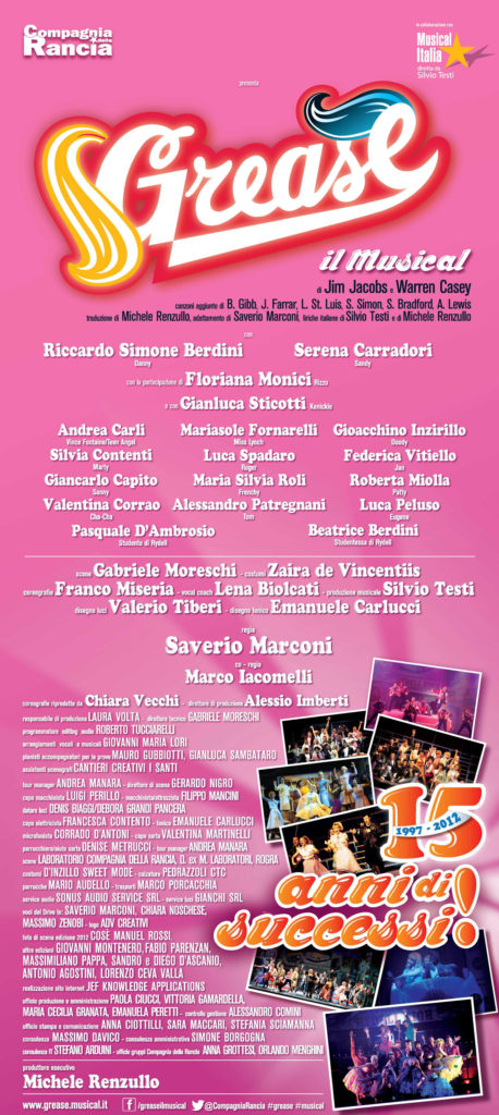 Lo spettacolo ha alternato sul palco, dal suo debutto a oggi, più di 120 artisti, rappresentando per molti di essi un trampolino di lancio. In questa nuova edizione, diretta da Saverio Marconi con la co-regia di Marco Iacomelli, il ruolo di Danny è affidato a Riccardo Simone Berdini, già protagonista di “Happy Days” e “Pinocchio”, mentre nei ruoli delle protagoniste femminili ritroviamo Serena Carradori (già Sandy nelle edizioni 2007/08 e 2009/10) e Floriana Monici (già Rizzo dal 2003 al 2006) mentre Gianluca Sticotti è Kenickie.