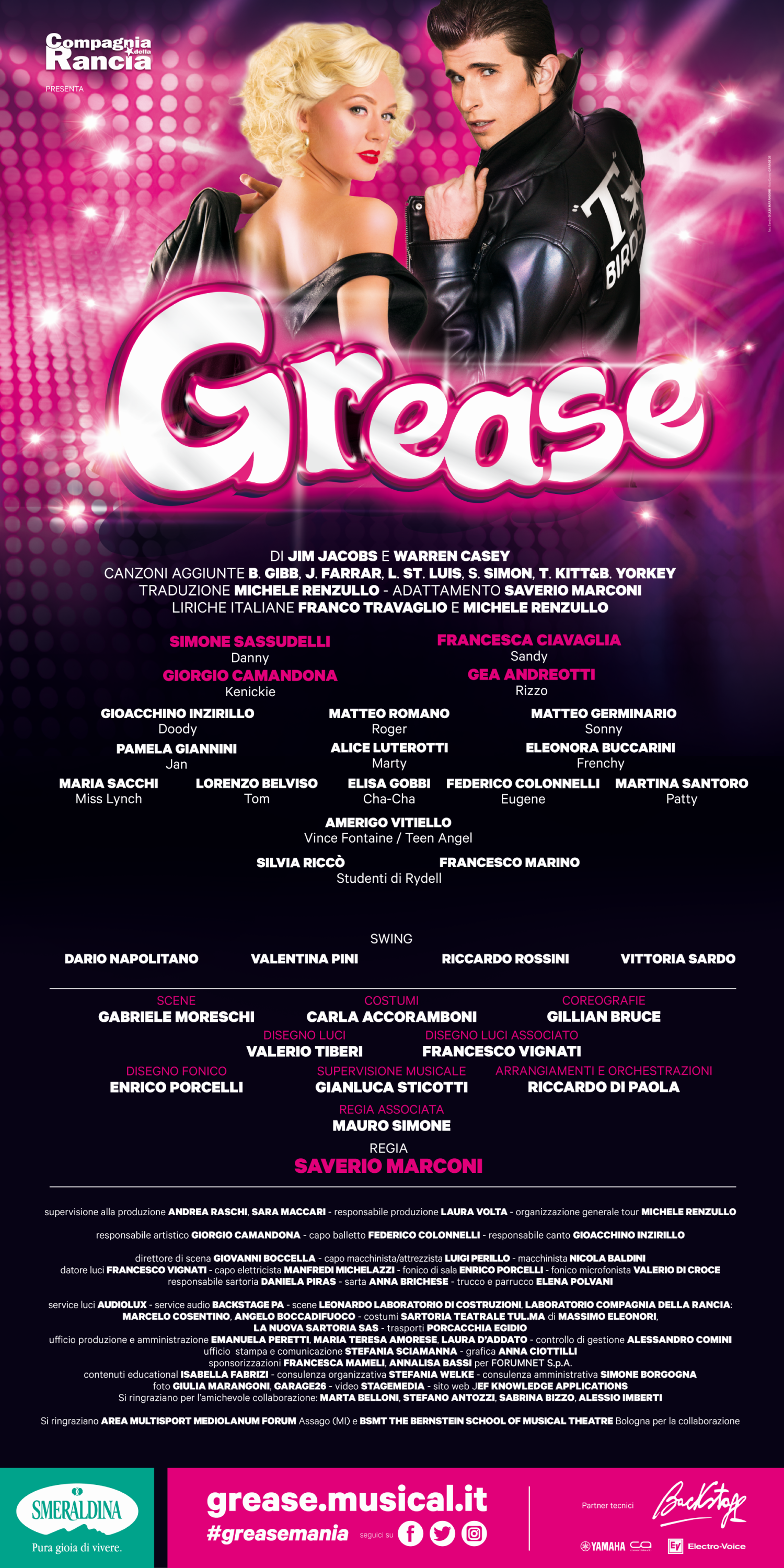 In più di 20 anni di successi in Italia, si è trasformato in una macchina da applausi, cambiando il modo di vivere l’esperienza di andare a teatro. Oggi GREASE è una festa da condividere con amici, figli, famiglie intere o in coppia, è trascorrere due ore spensierate, è non riuscire a restare fermi sulle poltrone ma scatenarsi a ballare: un inno all’amicizia, agli amori indimenticabili e assoluti dell’adolescenza, oltre che a un’epoca – gli anni ’50 – che oggi come allora rappresentano il simbolo di un mondo spensierato e di una fiducia incrollabile nel futuro e nel progresso.