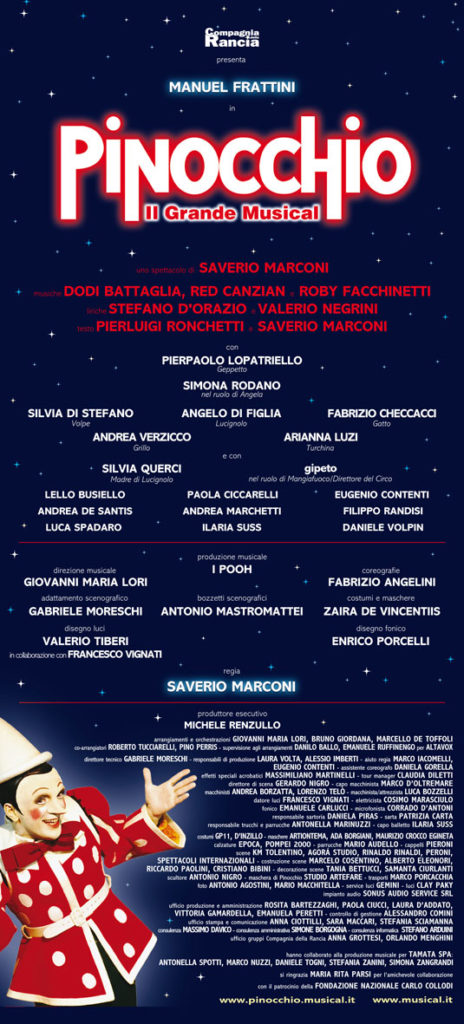 Pinocchio, uno dei più grandi musical mai realizzati in Italia, dopo aver incantato oltre 350.000 spettatori di ogni età con un allestimento colossale in stile Broadway, torna in scena nei teatri italiani nella stagione 2009/10.