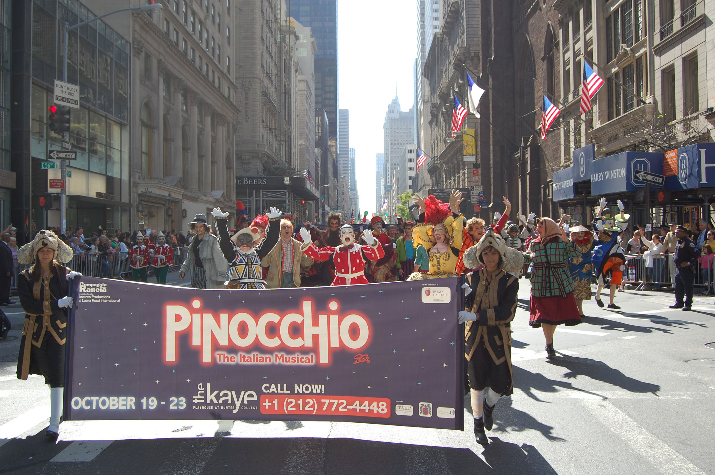 La sfilata per il Columbus Day 2010 si è colorata di musica e teatro: l’11 ottobre 2010, infatti, il cast del musical tutto italiano Pinocchio ha partecipato alla parata lungo la Quinta Strada a Manhattan che, ogni anno, celebra la cultura italiana negli Stati Uniti. Nell’ambito delle celebrazioni Colombiane, Pinocchio è stato quindi in scena alla Sylvia & Danny Kaye Playhouse di New York dal 19 al 23 ottobre.
