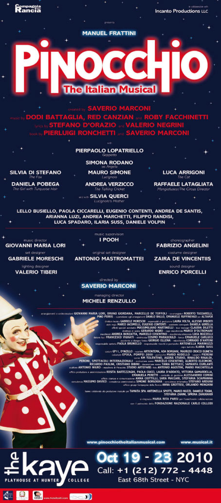 Un musical italiano non arriva in America dal 1964, quando fu la volta del Rugantino di Garinei & Giovannini; Pinocchio – uno dei simboli italiani più conosciuti nel mondo – conquista così anche il pubblico di oltreoceano con spettacolari cambi scena e coloratissimi costumi, canzoni che restano nel cuore e coreografie scatenate, per oltre due ore di spettacolo che diverte, commuove e sorprende con grandiosi effetti speciali. Lo spettacolo è stato proposto in italiano e ai lati del palcoscenico della Kaye Playhouse sono stati disposti due schermi con le traduzioni per gli spettatori americani.