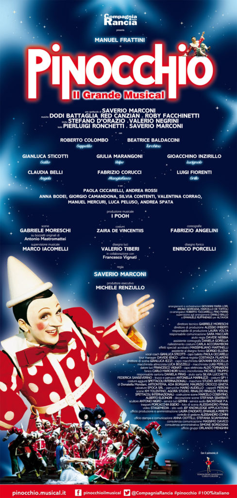 PINOCCHIO Il Grande Musical – scritto da Saverio Marconi e Pierluigi Ronchetti, con le musiche di Dodi Battaglia, Red Canzian e Roby Facchinetti e liriche di Stefano D’Orazio e Valerio Negrini – torna in scena con una nuova edizione nella stagione 2015/2016 con un lungo tour in tutta Italia, dopo il successo delle anteprime estive nei festival SEM Senigallia Estate Musical e La Versiliana e la straordinaria accoglienza al Teatro della Luna di Milano, costruito nel 2003 appositamente per il debutto del musical, durante l’EXPO 2015.