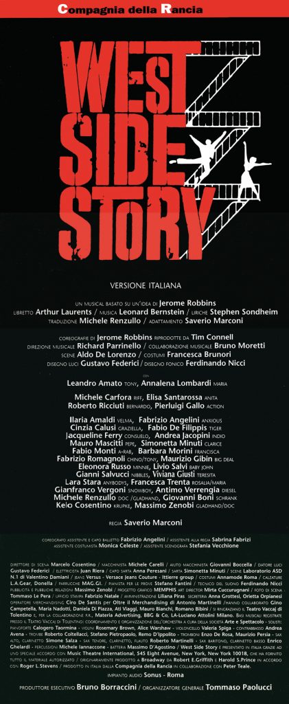 Questo musical è ispirato ad una delle storie d’amore più classiche di tutti i tempi: “Romeo e Giulietta“; rappresenta il destino delle bande di strada e quello di un giovane amore nella New York degli anni Cinquanta. Si tratta, in fondo, di uno spaccato di vita metropolitana americana. L’atmosfera è elettrica, l’azione drammatica è piena di colpi di scena. I giovani si trovano a vivere in un tempo e in un luogo del tutto particolari, nei quali la cruda realtà della vita cancella ogni innocenza. La storia si snoda tra momenti di poesia, di umorismo e di vero e proprio dramma ed è punteggiata da indimenticabili melodie e brillanti sequenze di danza. La versione di Compagnia della Rancia è stata presentata con una traduzione completa in italiano, inclusi i testi delle canzoni. Per realizzare questa edizione, la prima assoluta italiana, è stata impegnata una grande compagnia di trentadue ballerini/cantanti/attori accompagnati da un’orchestra di quindici elementi; la scelta della musica dal vivo è sicuramente più impegnativa rispetto al nastro registrato, ma permette di garantire una qualità del suono all’altezza con la bellissima musica di Bernstein. La coreografia, curata direttamente dal gruppo dei collaboratori di Jerome Robbins, assicura una danza di altissimo livello, in linea con le edizioni statunitensi o inglesi. All’abile regia di Saverio Marconi il compito di amalgamare tutti questi meravigliosi ingredienti con il suo gusto estetico tipicamente italiano già apprezzato nei precedenti allestimenti della Compagnia della Rancia.