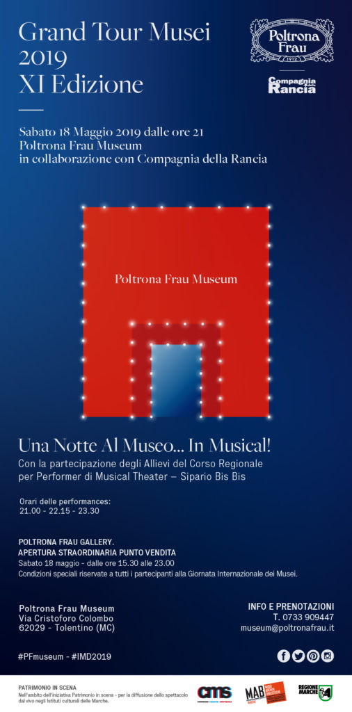 In occasione della Notte dei Musei 2019, la Compagnia della Rancia propone i brani più famosi di 100 anni di teatro musicale, in una serata pensata in esclusiva per il Poltrona Frau Museum a Tolentino: “Una Notte al Museo… in Musical!”.