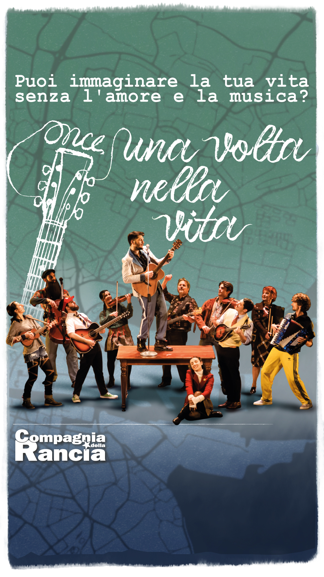 Una volta nella vita (Once) è molto di più di una storia d’amore, è un meraviglioso inno alla vita, in cui si ride (tanto!), si piange e ci si emoziona; è un vortice magico, tra speranze, coraggio e vita reale, in cui la musica è la terza protagonista, perché l’elemento che rende unico questo spettacolo costituisce anche la sua sfida più grande: far suonare l’intera partitura dei brani per mano degli stessi artisti. Sul palco, infatti, un eccezionale gruppo di 11 artisti che, oltre a cantare, recitare e danzare, suonano una moltitudine di strumenti!